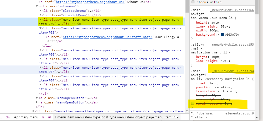 It is very slight but it is noticeable. In between Mass Times and Our Clergy & Staff in the picture below you can see a bit of the 'W' of "What's Happening" in that "white space". It looks like it happens on the all the sub-menus in between the first and second sub-menu item. Fix it please to be the white line.