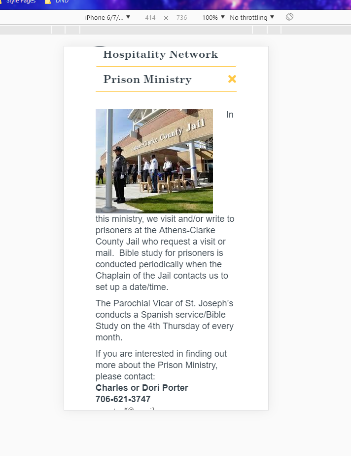 https://stjosephathens.org/ministries/ > Social Concerns Tab > Prison Ministry Accordion. The images within the Accordion should stack over/below the content. Not with some content to the left or right of it.