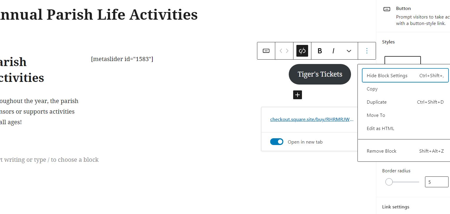 For the button, that will just hide the block settings, which will just hide the pane on the right, in this case, you can just "Copy" the button from that same menu and then post it on another "Private" or drafted page, so it can't be seen. That way you have it for future use, and then you can just remove the button block there. You will also have the link and button saved in the revisions for the page.