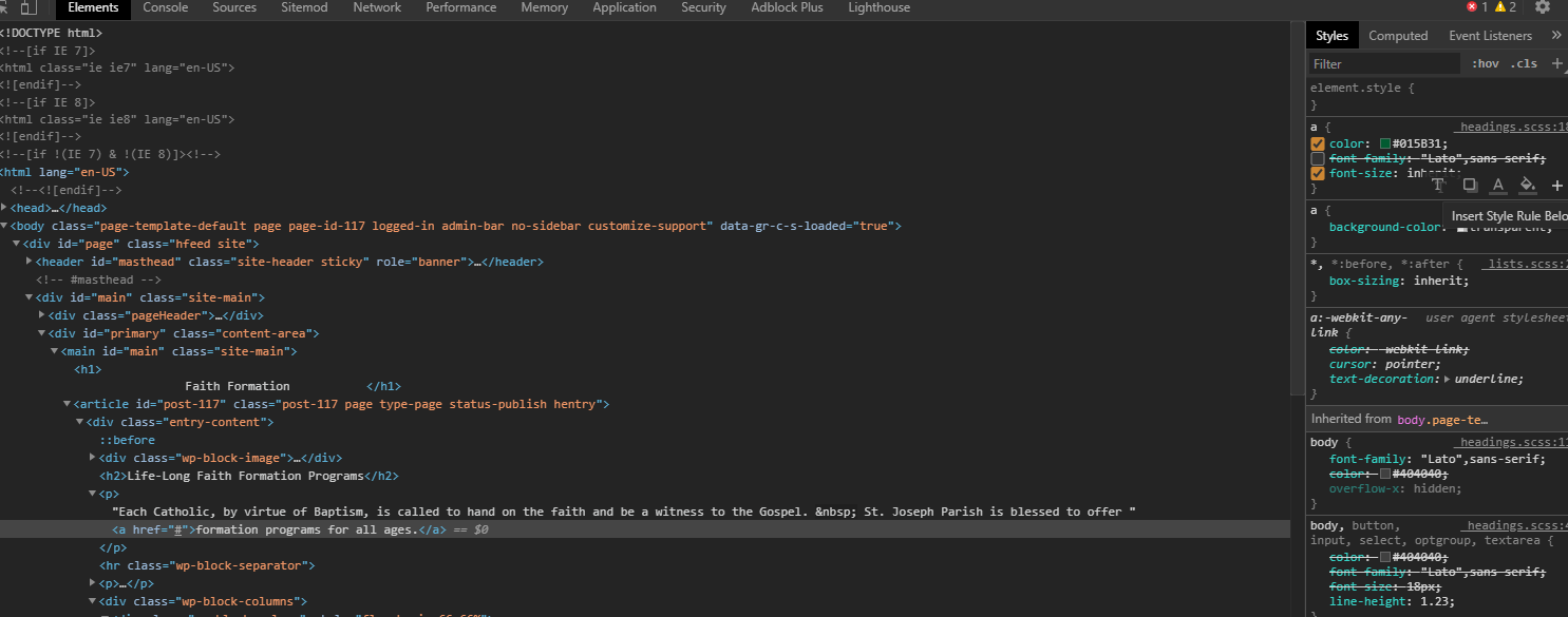 Comment out the hardcoded font, don't need it from the looks of it and then inherit the font size. please and thanks. https://stjos.diocesanweb.org/faith-formation/