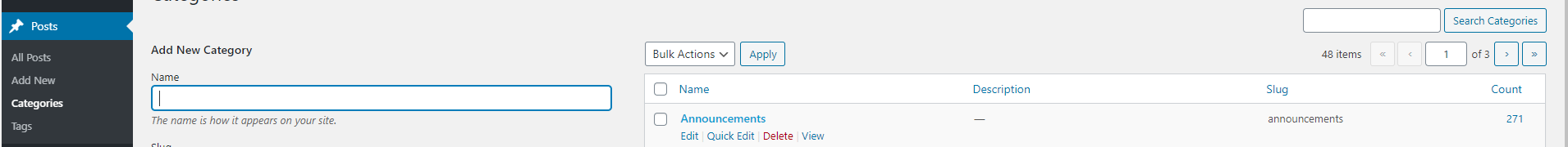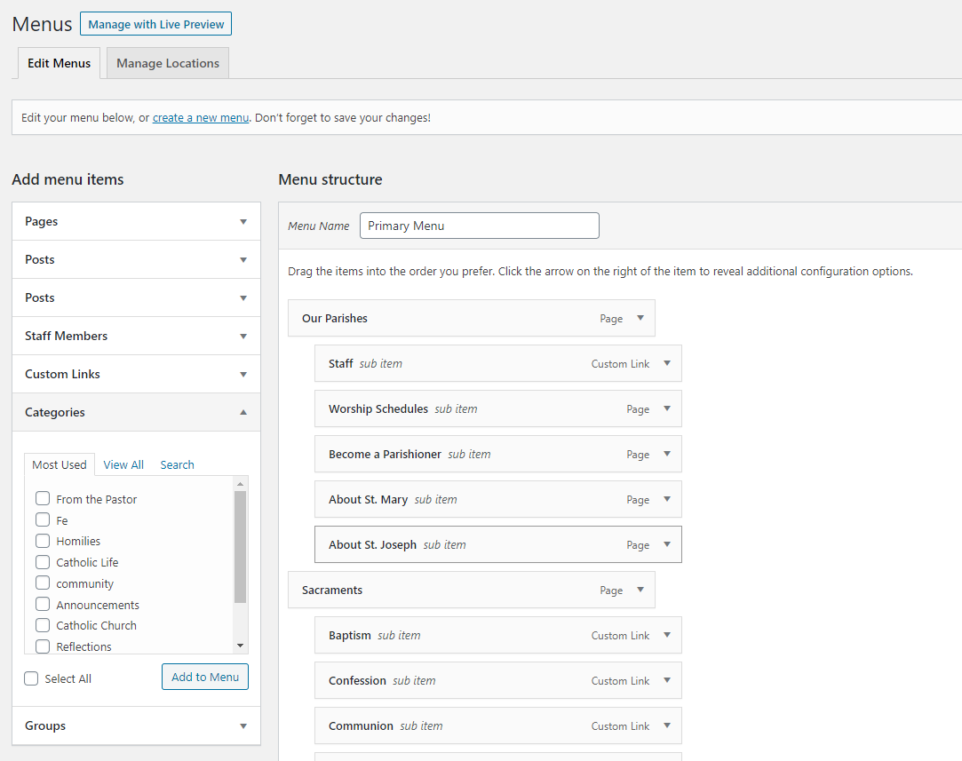If you wanted to manage categories and view them yourself, so you can copy the link to a page or post, you can go to Categories under the Posts menu in the backend. You can delete Categories that are no longer needed, and you can get the links to Homilies and Audio Categories to put on pages from there by hovering over them and clicking "View".