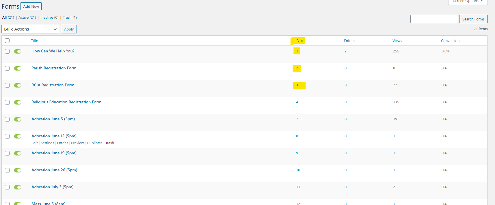 7. If you wanted to have separate forms, which is an alternative, having 16+ forms would not be a problem. I would suggest having each form on a separate page or post and then having a page with buttons or links to each of those respective form pages. I think that would make it the easiest. That way you could have a link to a Mass Sign Up page, and then buttons that go to each sub-page or post, with the form for that Mass. You could duplicate the forms to make it easier. Just make sure that the first form is perfect (Fields, Form Settings, Confirmations, and Notifications) before duplicating it 15 times. Make sure to switch the notification to you and not to have it go to us.