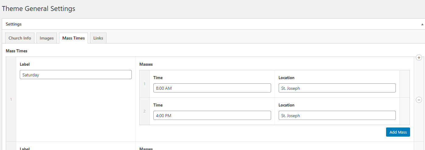 Where are the actual Mass times that we see on the home page coming from? I see them nowhere in the back end. I can tell something is there, but there is a big blank space below the link to the live stream. I assume this is where the fields for the Mass times go.