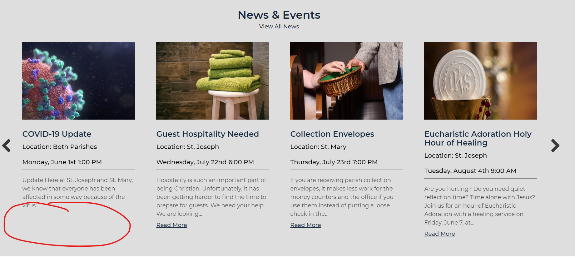 From the list: Build ✔ Homepage - Posts should always have a read more link, for cases of non-text in the content, or if they used a custom excerpt Cody A. added this on May 08, 2020 Completed May 15, 2020 by Kyle S. Assigned to Kyle S. Notes image.png 1010 KB • Download Comments & Events Kyle Sullivan, Web Development There isn't more content for users to read more here. That said, I wrote a hacky workaround to achieve the goal sought here with CSS. image.png 983 KB • Download May 15, 2020 at 3:22 PM Notified 1 person Kyle Sullivan completed this to-do. May 15, 2020 at 3:23 PM Kyle Sullivan, Web Development .newsSingleExcerpt { .readMoreLink:not(:first-child) { display: none; } } May 15, 2020 at 3:25 PM Notified 1 person