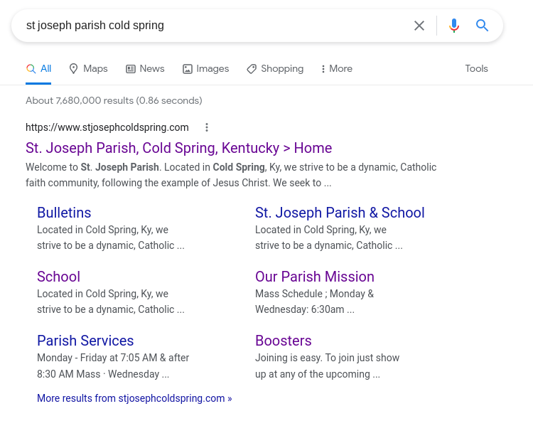 Can you check in to why the domain stjosephcoldspring.com (http://stjosephcoldspring.com) is NOT being used and you are just redirecting it?? See email from David Green pointing out the problem doing it that way.