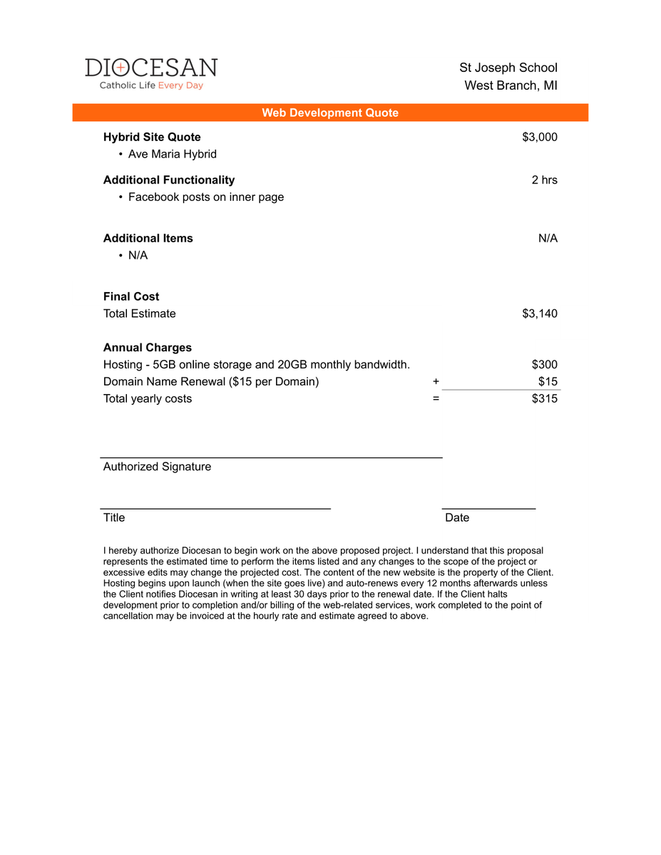 During the Deep Dive conversation, it was determined the Ave Maria Hybrid will be the foundation for your new website. We will also add the development to make the Facebook icon take the visitor to an inner page that has all of the Facebook posts. All of the posts will be pulled into the website. After we apply your branding, fonts and colors, and content you will have a unique website that showcases St Joseph School.