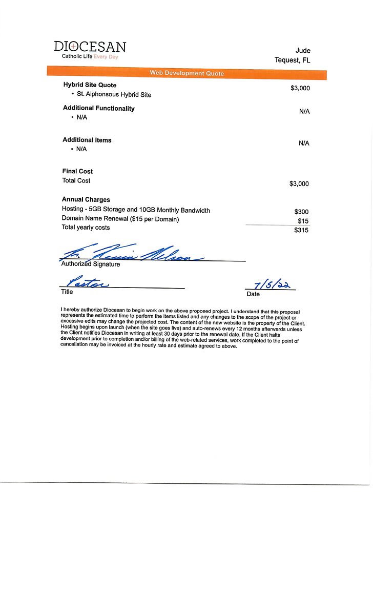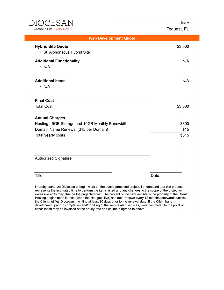 During the Deep Dive conversation, it was determined the Alphonsus Hybrid will be the foundation for your new website. After we apply your branding, fonts and colors, and content you will have a unique website that showcases St Jude. I have added the cost of our prayer wall as well. You will find the $150/yr in the Annual Charges section along with our hosting prices.