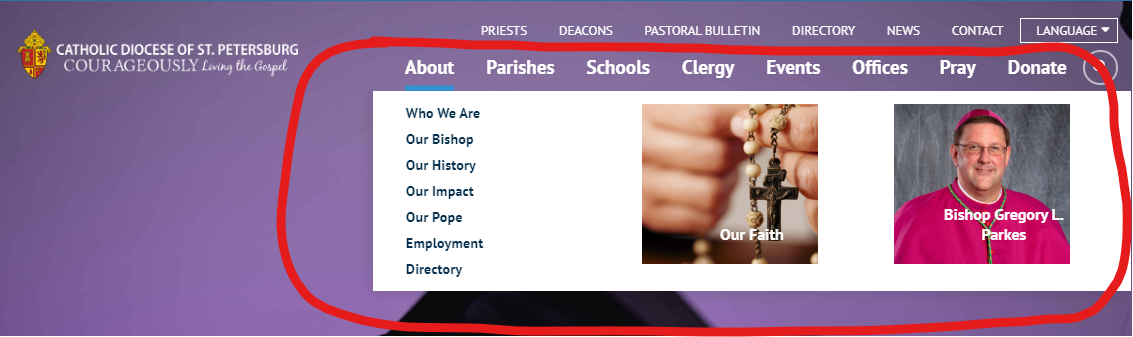 During our Deep Dive conversation, we discussed using a menu similar to the Diocese of St. Petersburg. On their site, they have 2 menus. The Quick Menu [Top] is above, in smaller font (no dropdowns) and the Main Menu [Lower] is larger and allows for dropdown menu items.