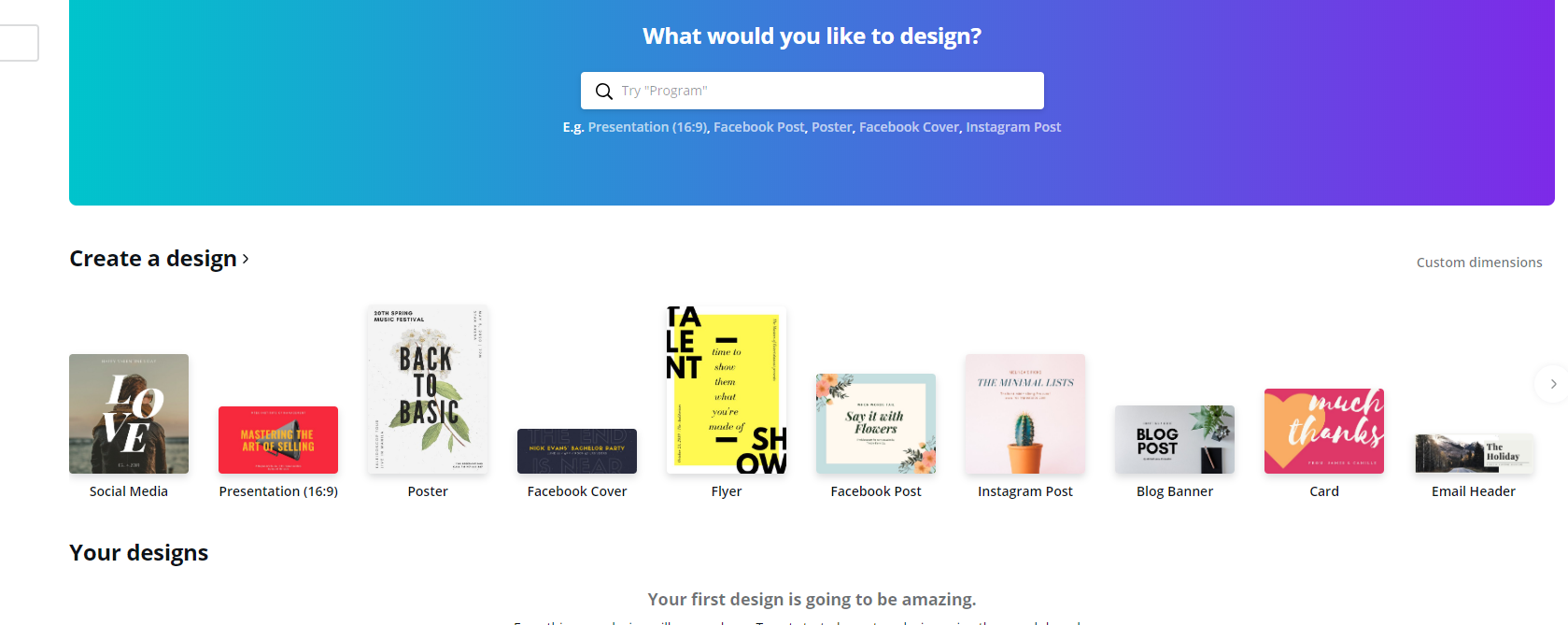 Screenshot from Canva - the "custom dimensions" is on the right, under the blue rectangle: