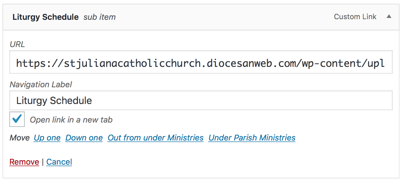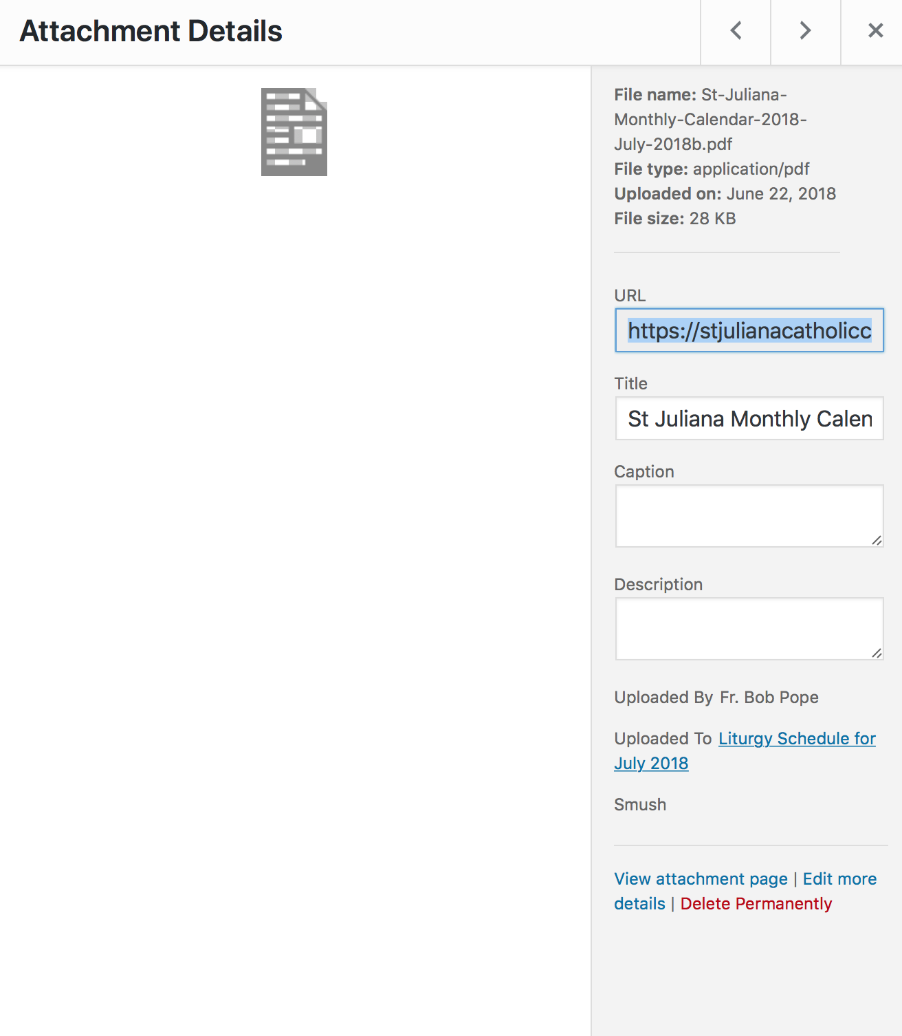 The April liturgical schedule was uploaded to the Media Library, then I put that link in as a Custom Link in the menu. I have made the appropriate changes for the July schedule to now display.