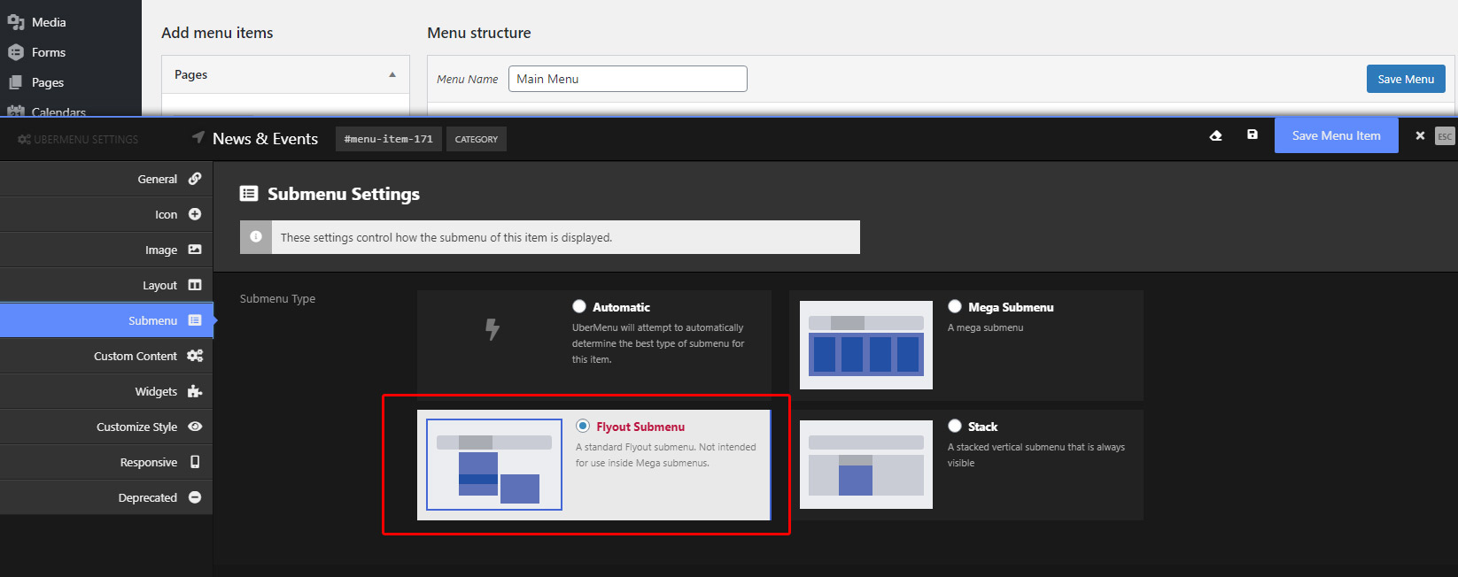 Ubermenu will default to "Automatic" sub menus, and we want "Flyout". To set this, simply click the Ubermenu toggle while hovering a top level item, click the submenu tab, and select "Flyout Submenu" as seen here: