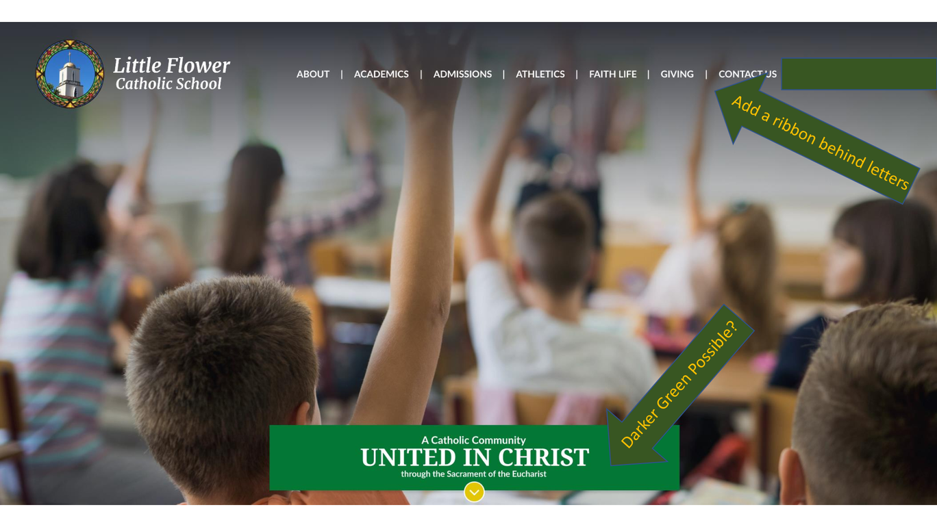 Thank you for your patience. Please see the attached pdf of the web page design with suggestions for Little Flower Catholic School. The colors need to be a little darker and we definitely need to add "Hollywood, FL" to our top left logo corner. Also, see the attached image - we'd like to have something similar for a Quick Links. If we can't do a separate area like they have on the right, then definitely in the main menu bar. We are compiling images to replace the stock photos.