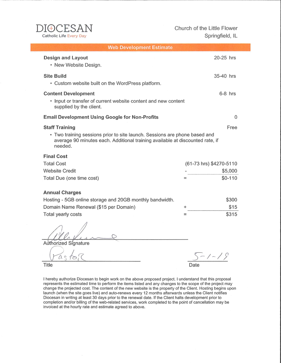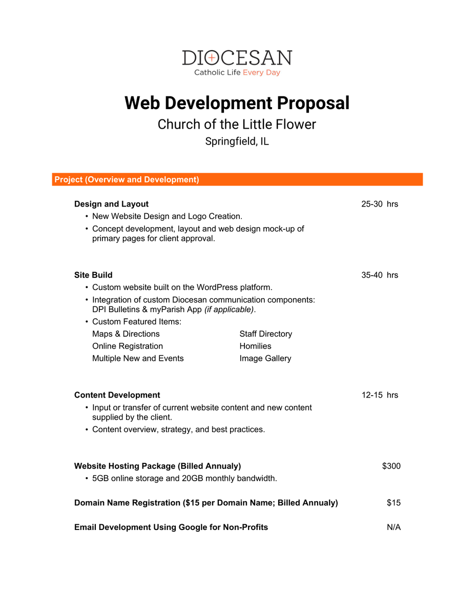 Part of what put the quote at the high end of $5950 was logo creation. That additional piece is budgeted at 5-6 hours ($350-420). We could remove that piece of the proposal, which would drop the quoted price. If you would like we could also lower the Content Development time if the parish is willing to move some of the content from the old website to the new one versus Diocesan staff moving all of it.