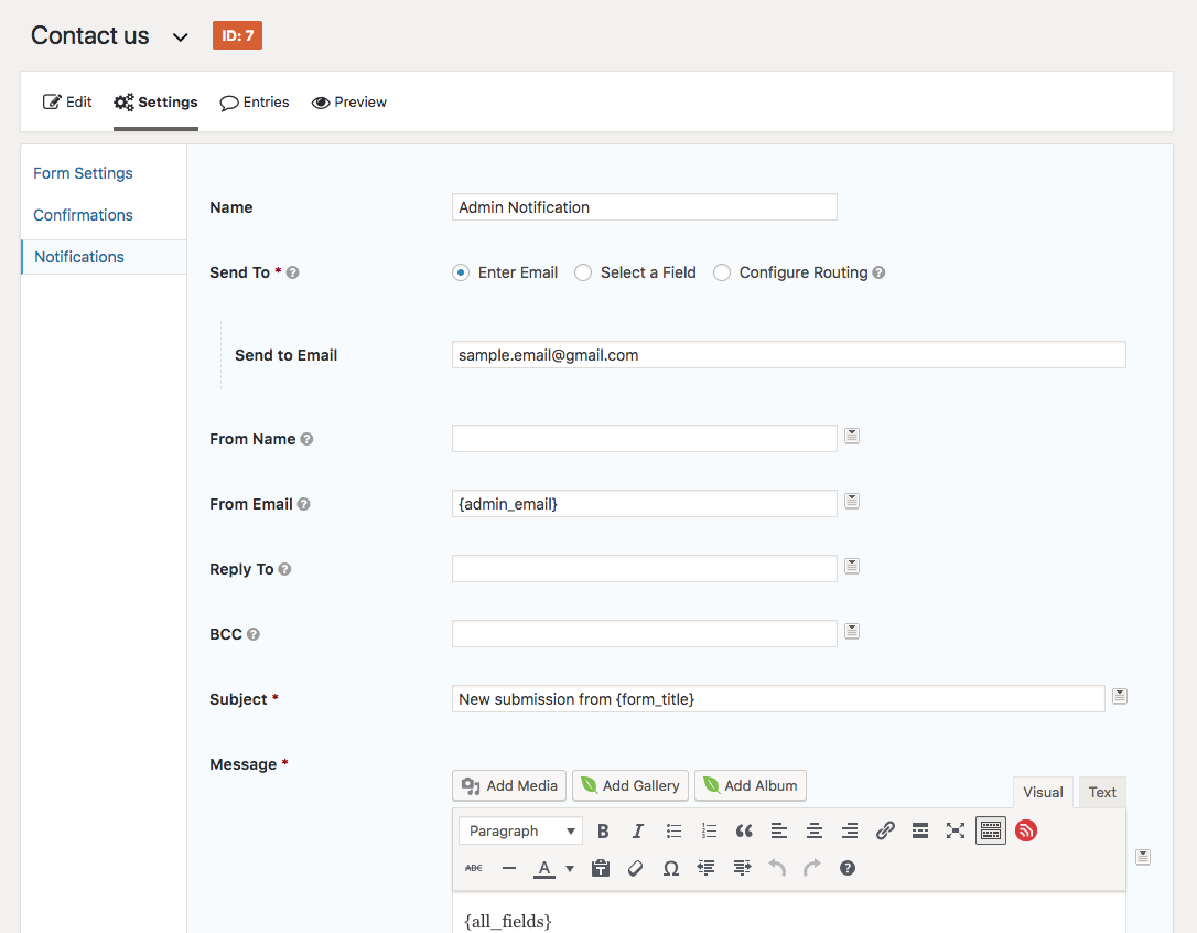 I checked the "Contact Us" form notification settings and noticed the Send To email was sample.email@gmail.com.