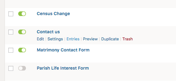 I'm not sure why or when that may have been set, but I changed it to StLouis.Info@stlouis.cdom.org. Entries for a particular form are saved on the site, and can be found by opening the list of forms, and clicking Entries. (Appears on hover)