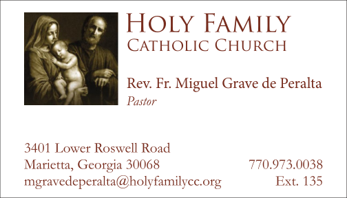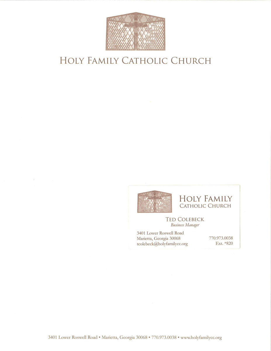 I’ve attached our current logo and an image that our pastor likes, but we are not at all tied to that image. Just to give you an idea of what he likes. He is traditional, doesn’t want something that looks like it is from the 70’s; and the bottom line is he want the image to be of the Holy Family.Our letter head and business cards use an off-white/cream color.Thanks for your help!KathleenKathleen DaigleBusiness ManagerHoly Family Catholic Church3401 Lower Roswell RoadMarietta, GA 30068770-973-0038, ext 113
