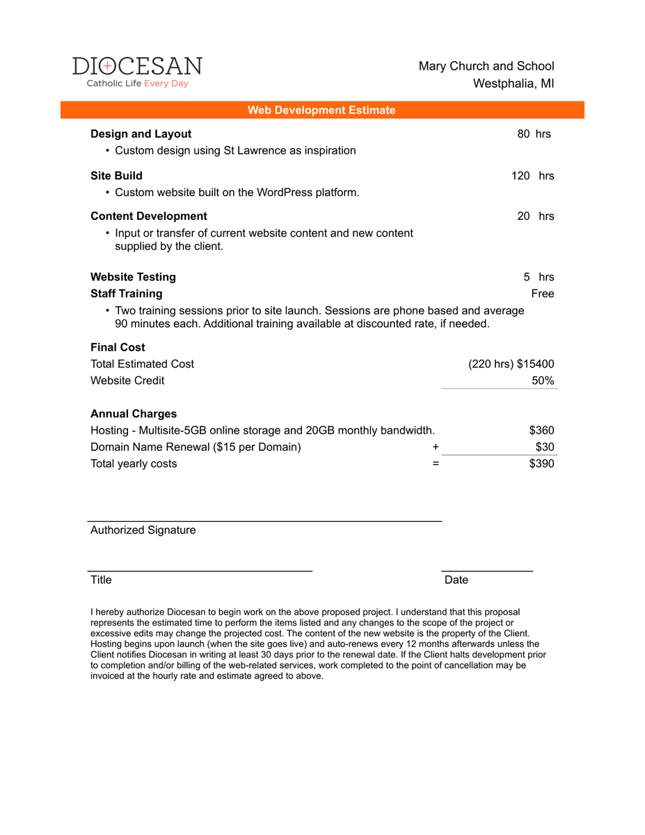 Hi Alan, I will pass this proposal by Fr. Eric and our Finance Council. We do need some verification on what the 50% website credit entails. Is there a discount on the total cost of $15,400 or is the discount applied in other areas.
