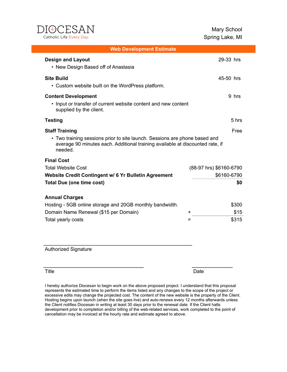 The attached proposal breaks down the project into each phase. Each phase has an estimated number of hours we feel it will take to complete. I also just spoke with Brian Bastic. He mentioned after speaking with Father, there will be a new bulletin contract. Part of this contract will be to cover the school website project. I have included this note in the proposal.