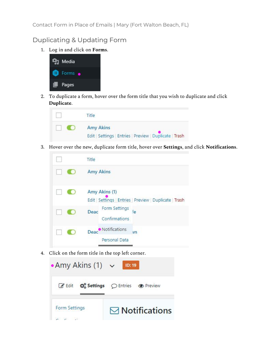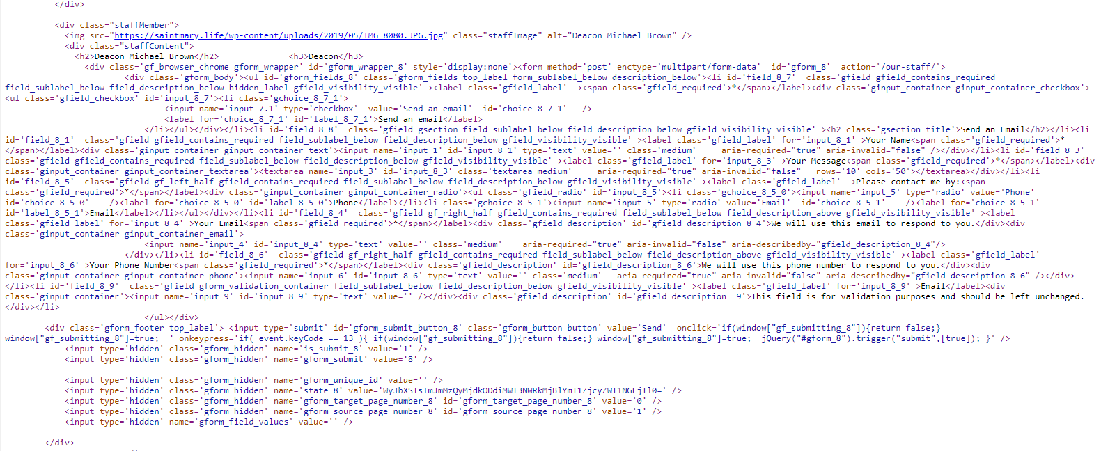 Since forms are already created for all of the parish staff members, you can simply add a "Forms" block, select the person, and it will pop in the form on any page or post. If you need to add a new form for a person, I have attached are the steps I'm using to create these contact forms so that you can use them on ministry pages in the future.