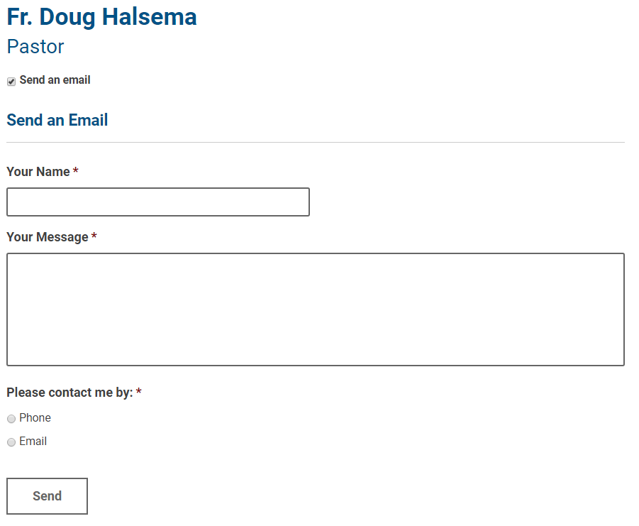 If you visit the staff page (https://saintmary.life/our-staff/), you will see that I have added a checkbox to send an email. Once a person checks that box, the fields for the email appear below. I have done this so the page isn't just full of 20 forms. Once they click send, the filled out form will be emailed to the appropriate staff member (configured within the form's Settings > Notifications > Admin Notification).