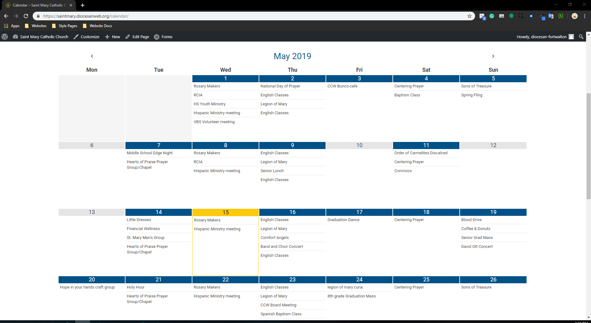 From the list: Content ✔ Google Calendar ID: Veronica A. added this on Mar 19, 2019 Completed May 15, 2019 by Cody A. Assigned to Cody A. Notes saintmarychurchfwb.org_kdn9r4io1ecutugc3r1jvra1pc@group.calendar.google.com Comments & Events Cody Armock, Web Content Specialist https://saintmary.diocesanweb.org/calendar/ image.png 175 KB • Download May 15, 2019 at 5:24 PM Notified 1 person Cody Armock completed this to-do. May 15, 2019 at 5:24 PM