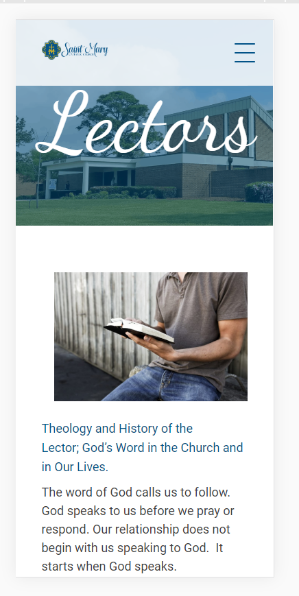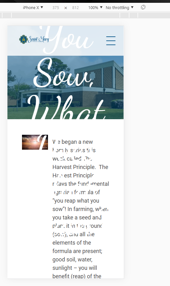 For Mobile: Image first like second snip where it is centered and takes up a bit of space, but can still see content. Then Title like linked to-do, then a little spacing, then content. Thanks. This for Homily posts, my catholic life posts, and parish events. Basically all posts. Content should take up all the width or the approved width 100% so it is full-width of container etc..