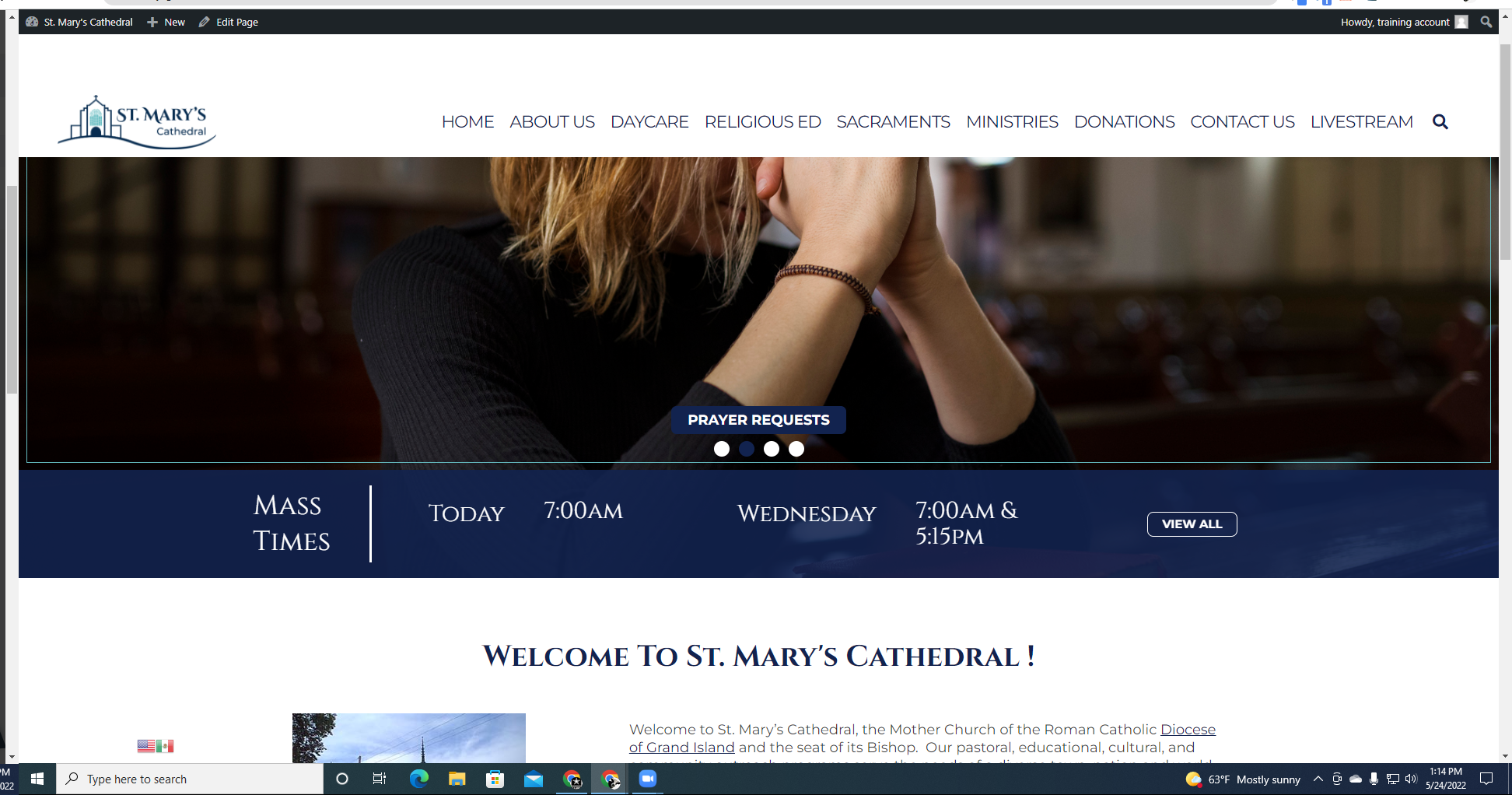 3. Welcome area homepage, photo of cathedral larger size? when it tried to change the image size to another image it remained that size. She wants a standard image size for all images.