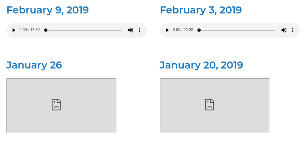 The audio homilies for December 2018 - present are displaying on the website through posts. Specifically, the Homily Podcast post category. For each of these posts, there should be a title (date) and content (iFrame or uploaded audio file).
