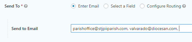If you are trying to send the message to multiple emails dependent on a field the visitor selects, then please give me a call and we can run through a quick, free training on how to set up conditional fields to configure routing.