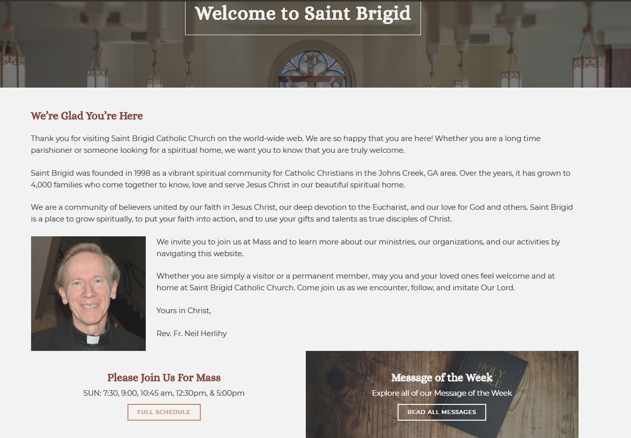 ✔ "Learn More About Who We Are" button in header area like Saint Brigid-Johns Creek
