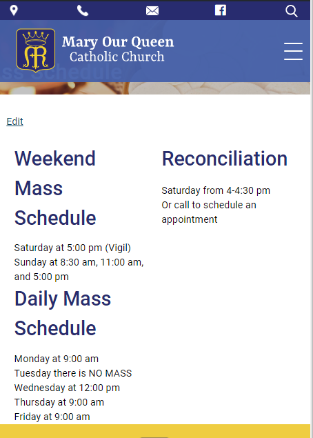 From the list: Build ✔ Page titles are hidden on mobile Veronica A. added this on Nov 06, 2018 Completed Feb 21, 2019 by Kyle S. Assigned to Kyle S. Notes http://maryourqueen.diocesanweb.org/mass-schedule/ image.png 87 KB • Download Comments & Events Kyle Sullivan, Web Development I added the following code to .post-launch.css. I believe this fixes this issue and actually centers the title./* Header */ header.entry-header, header.page-header { min-height: 7rem; } header.entry-header h1, header.page-header h1 { left: 50%; transform: translateX(-50%); margin: 0; } Feb 21, 2019 at 8:23 PM Notified 1 person Kyle Sullivan completed this to-do. Feb 21, 2019 at 8:23 PM