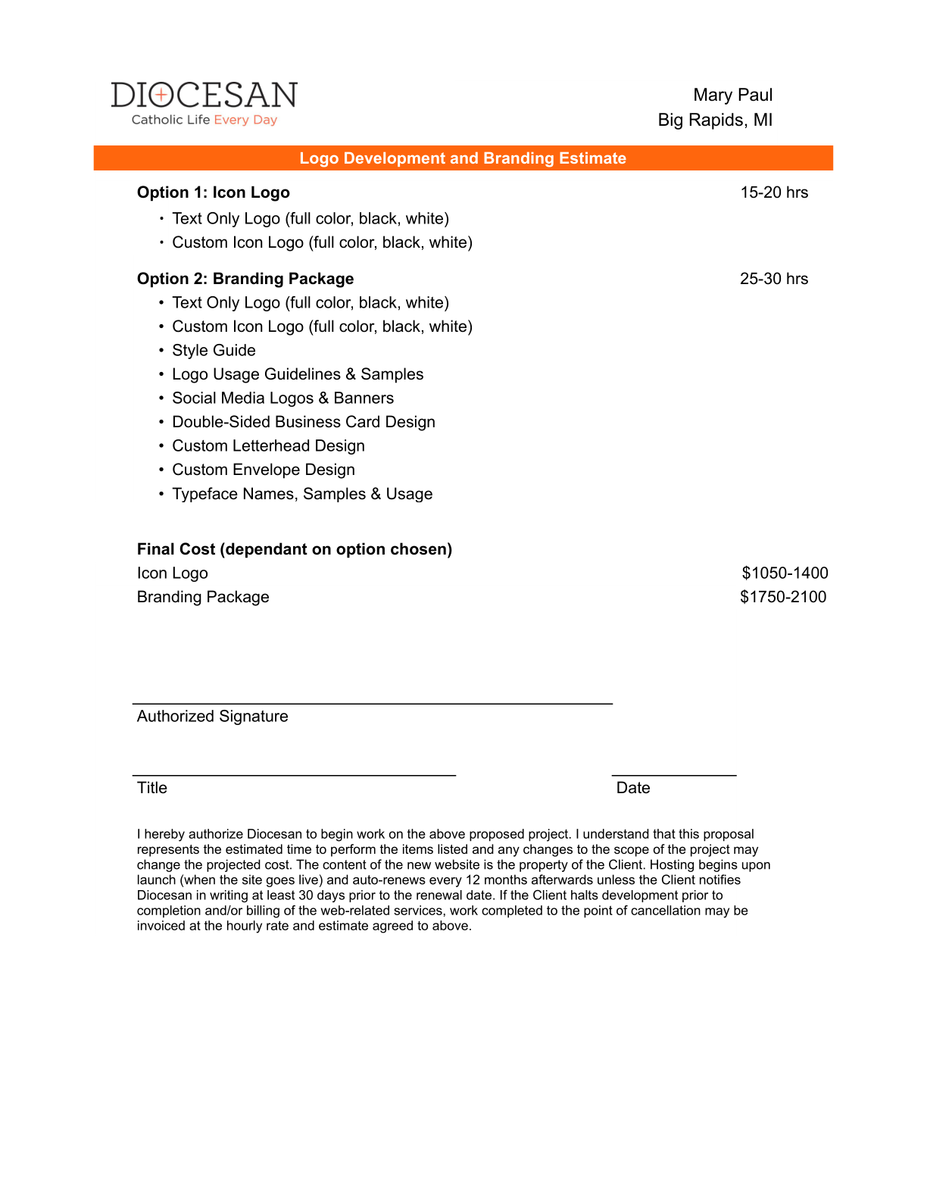 Based on where the design, and what we would need to do to finish the logo, I have put together a quote for our logo and branding package. The branding package includes the logo as well as a style guide in order to utilize the logo in multiple ways. This would include business cards, letterhead, etc.
