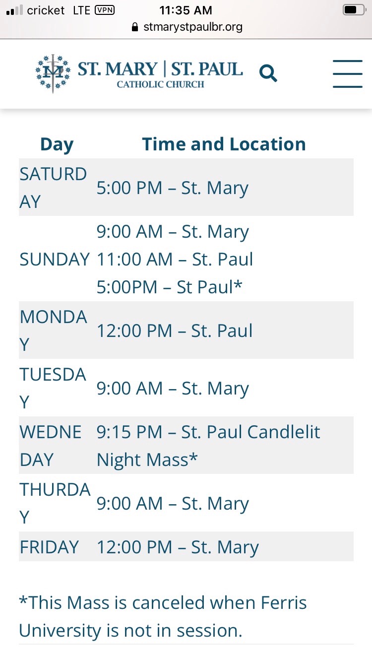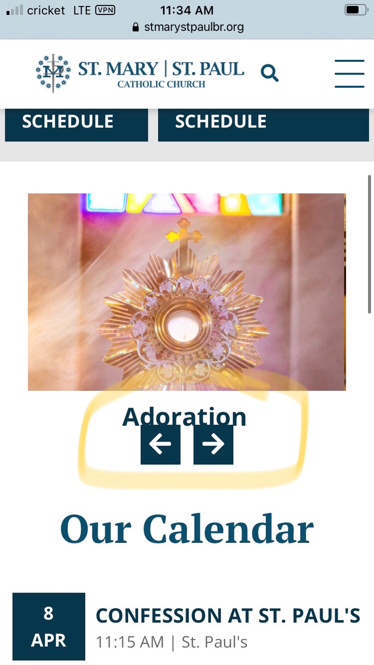 The website is viewable on my computer and also on my iPhone. But Fr. Jegar does not like the way it looks on the iPhone. He wonders if you can change that a little bit. For example, on the iPhone the left and right arrows are too close to the word adoration. And when you first come to the website, the Saint Mary logo is covering up part of the Saint Mary Saint Paul wording. He would like that changed.