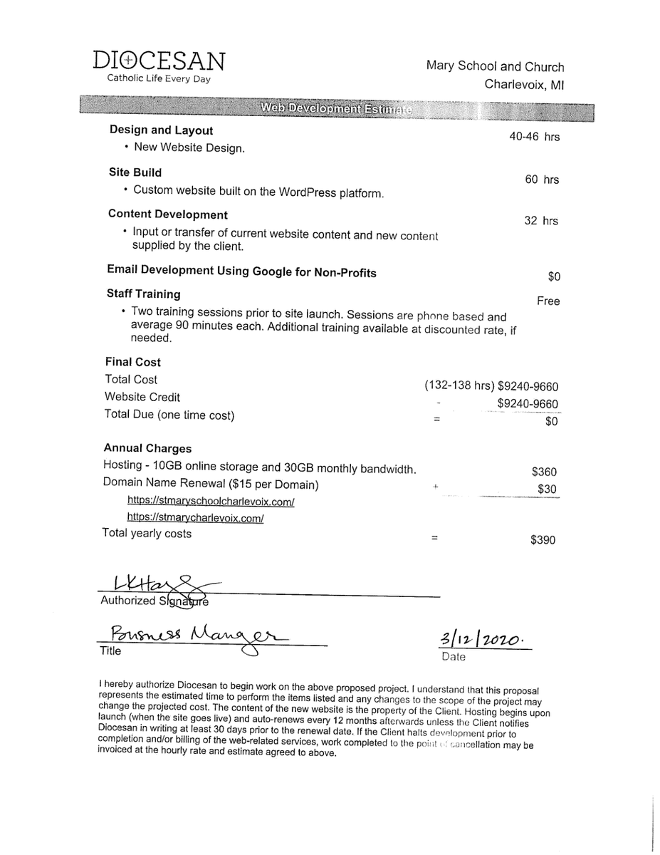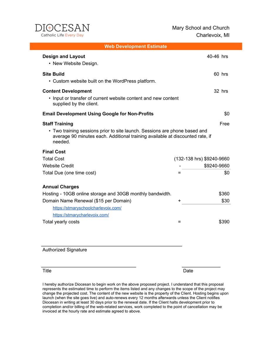 I am excited to hear that you will be moving forward with the proposal. We are looking forward to bringing St Mary a new school and parish website. All I would need is for a signed copy of the proposal. You can reply to this email with the signed copy attached.