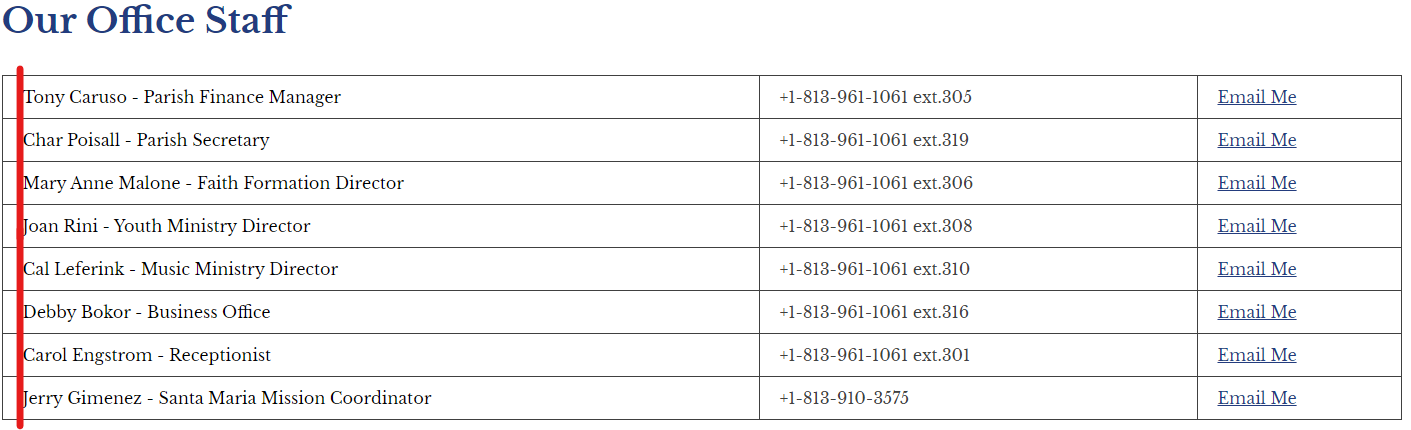 * As for the one with no extension, without reworking a major part of the staff page, adding a blank extension is the only way to line up the emails. The first four staff is still not lining up with the others below them. Pastor is very picky about this.