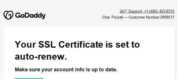 In the meantime, I have gotten a notice from GoDaddy that the SSL renewal is coming up and they would be auto renewing it. Is this something you guys are taking over? How should I handle this?