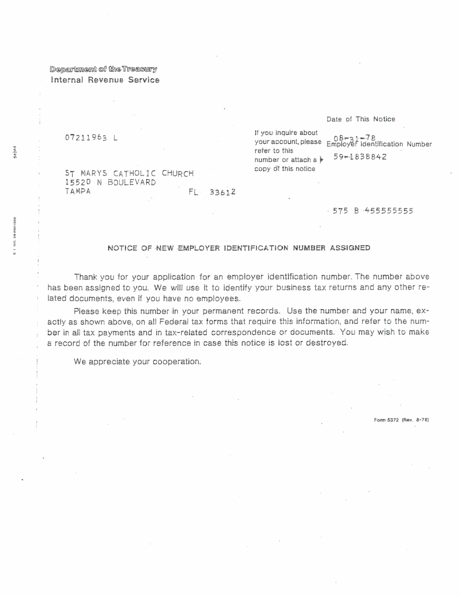 - St. Mary Catholic Church's Tax EIN - FEDERAL ONLY