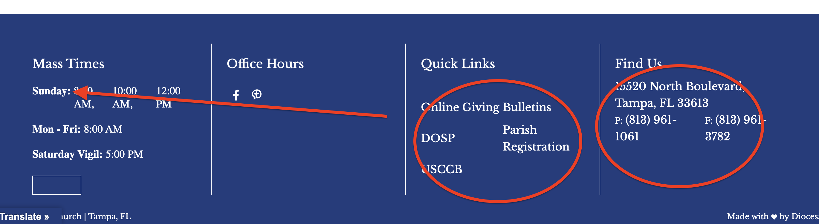 ✔ Footer - Make body copy in footer the same size as Mass times days