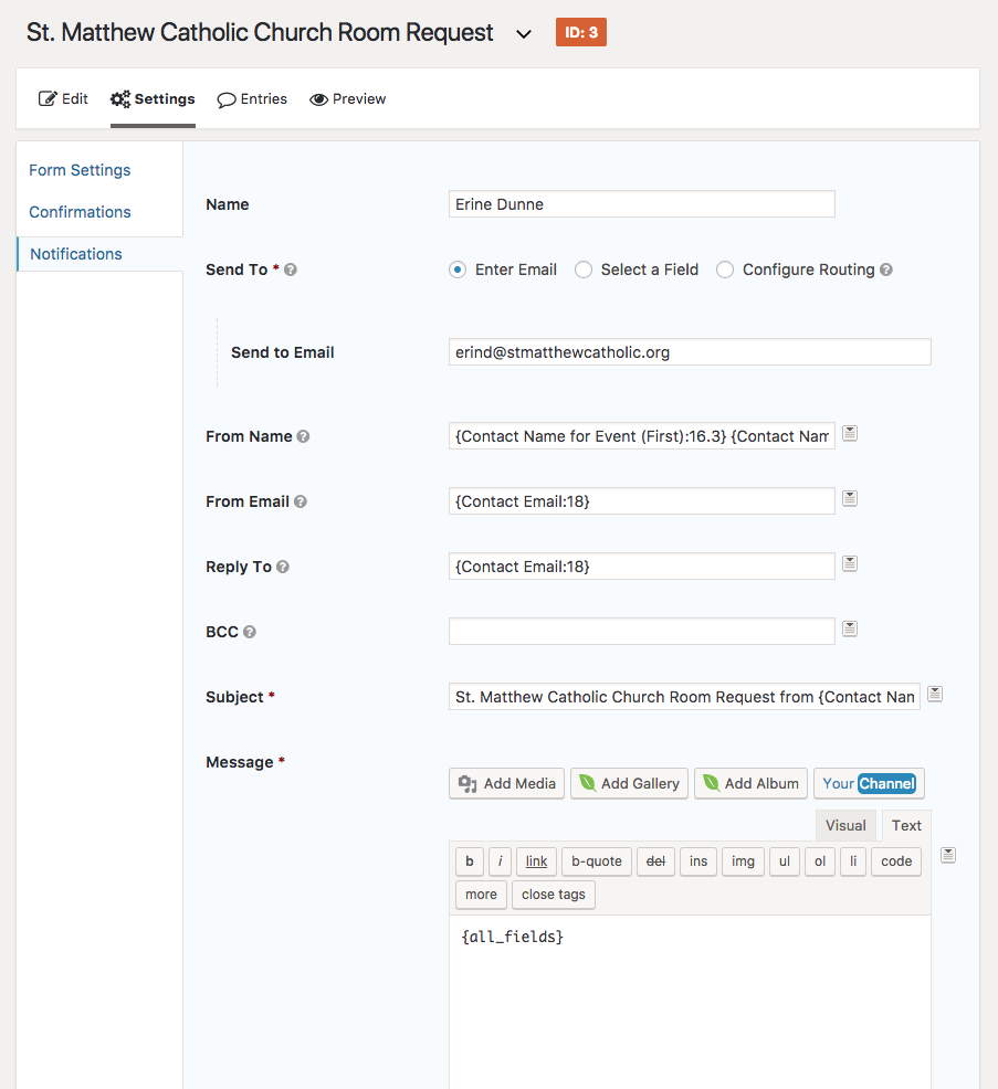 · The form I created that is tied to the page I made- I would like to know how to make sure when the form is submitted, it goes to a specific person. I tried to set it up to go to Erin Dunne at erind@stmatthewcatholic.org<mailto:erind@stmatthewcatholic.org>,. Could you maybe just take a look at our form and make sure the way I set up notifications and/or responses is correct?