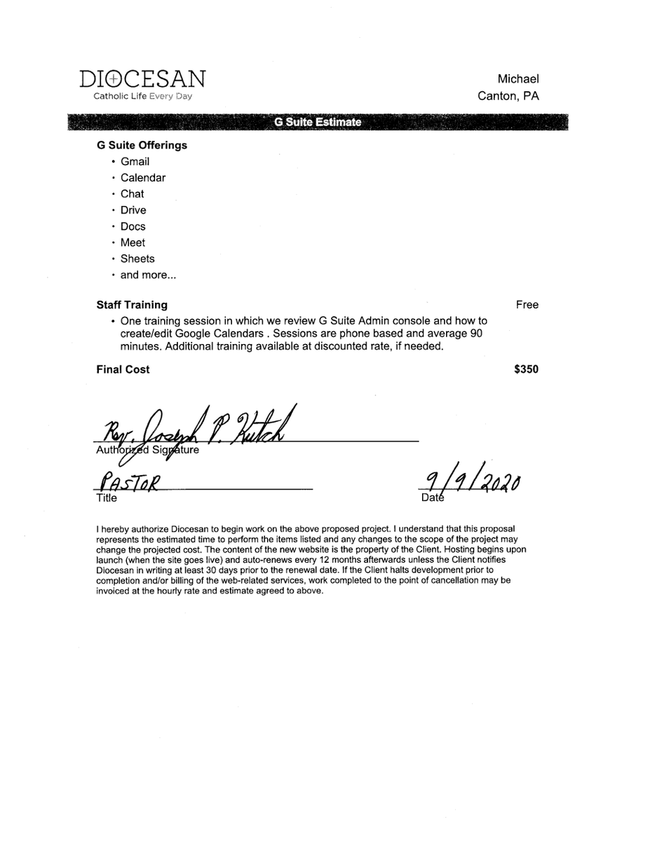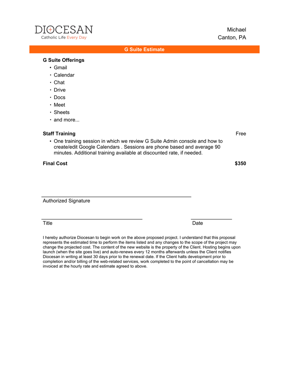 Veronica mentioned that you were wanting to us to set up G Suite for you. I have included a proposal that breaks down the G Suite offering and our one-time cost.