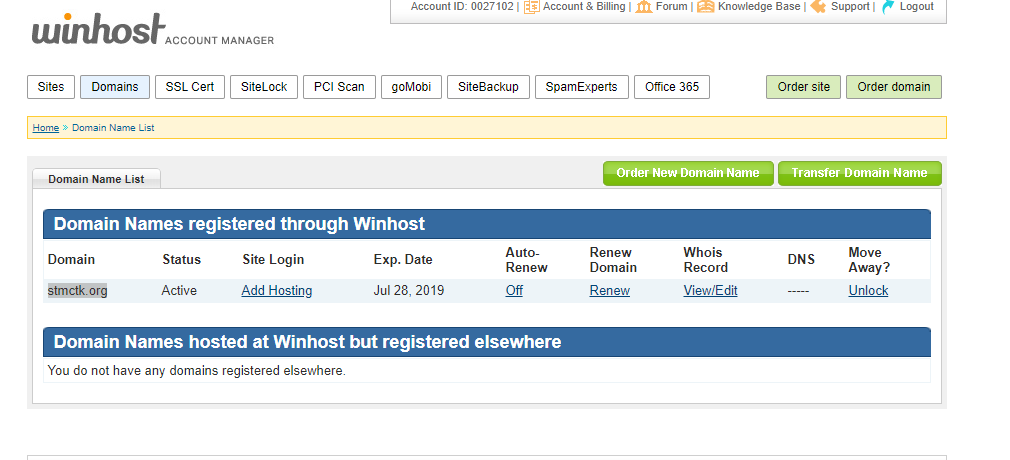 I was able to log in to Winhost. The account shows suspended as of 2018, and when I clicked on the domain to unlock it (which we have to do before a transfer) I have the message "The Domain Name has already been moved away."