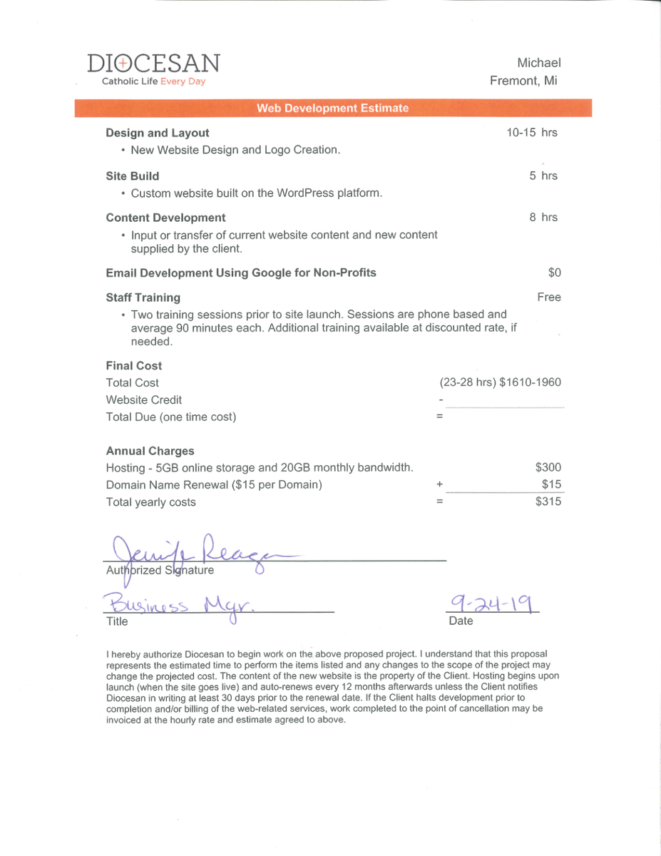 Attached is the signed estimate, as well as a picture of our St. Michael statue and a copy of our letterhead which has the font that I have been using. That does not mean these items must be used in the design. Just an idea. If something else looks better to you, let's see it! I'm open to suggestions.
