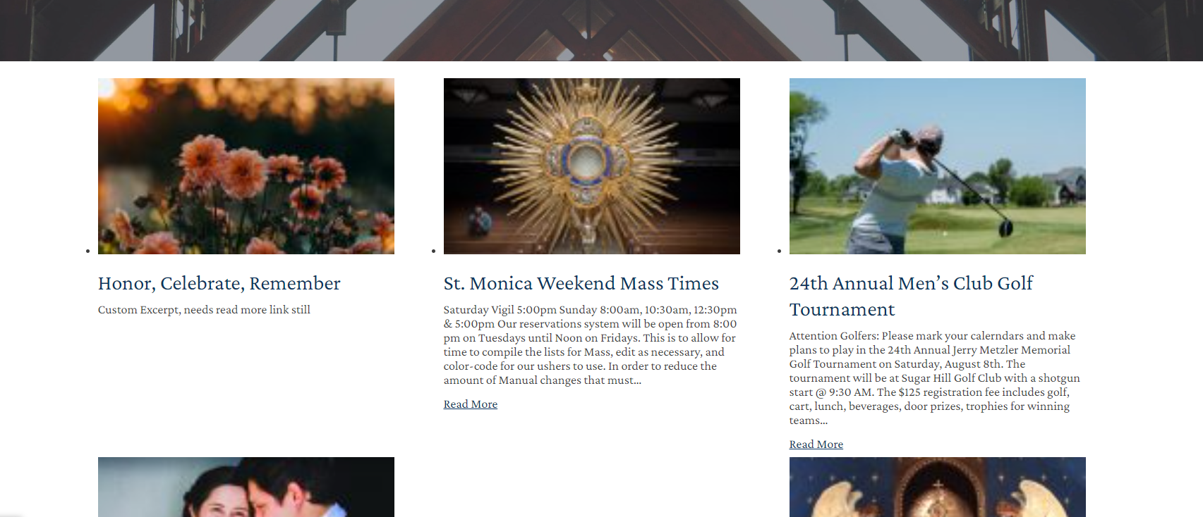 From the list: Build ✔ Archive page - Custom Excerpt should still show the Read More link Cody A. added this on Sep 25, 2020 Completed Sep 29, 2020 by Kyle B. Assigned to Kyle B. Notes https://monica.diocesanweb.org/category/news-events/ image.png 1.19 MB • Download Comments & Events Kyle Brown completed this to-do. Sep 29, 2020 at 6:29 PM
