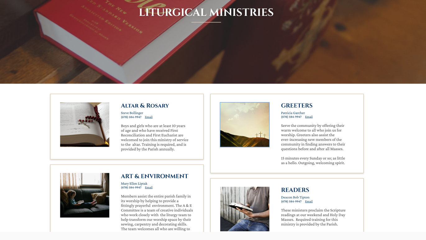 From the list: Build ✔ Ministry Cards - Not displaying staff/contact information Cody A. added this on Aug 10, 2020 Completed Aug 10, 2020 by Cody A. Assigned to Kyle B. Notes Proof vs Devhttps://monica.diocesanweb.org/parish-life/community-groups/ image.png 923 KB • Download image.png 991 KB • Download Comments & Events Cody Armock completed this to-do. Aug 10, 2020 at 2:35 PM