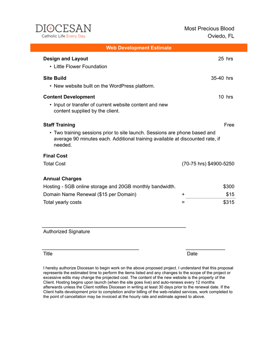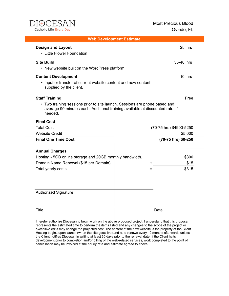Thank you so much for the information. I am a little confused on the cost. On our first conversation you indicated that a Hybrid site would cost between $1500 to $2500 to develop. And then, when we met on the Zoom call you mentioned that the site we liked, Mary, Queen of the Universe https://maryqueenoftheuniverse.org/ and St. James Cathedral https://stjamesorlando.org/ were both Hybrid sites, so I’m not sure where the increase in cost is coming from. Is Little Flower not a hybrid site? Or is it because of the adjustments we spoke about that it would make the site unique, and therefore the cost so high?