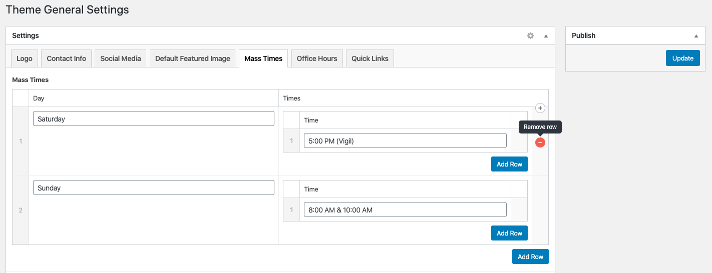 Once in Theme Settings, click the Mass Times tab. Here, you may hover on the right side and remove each row.