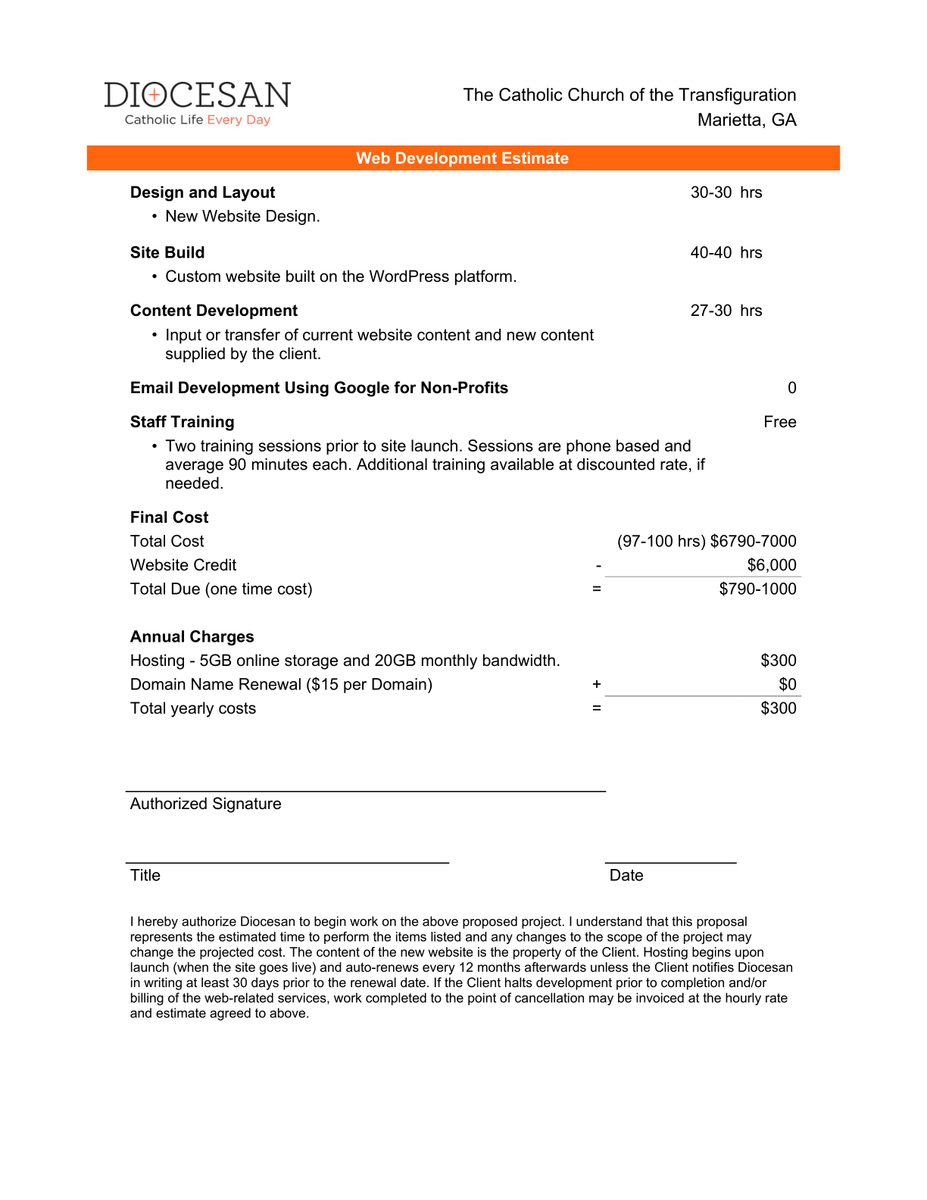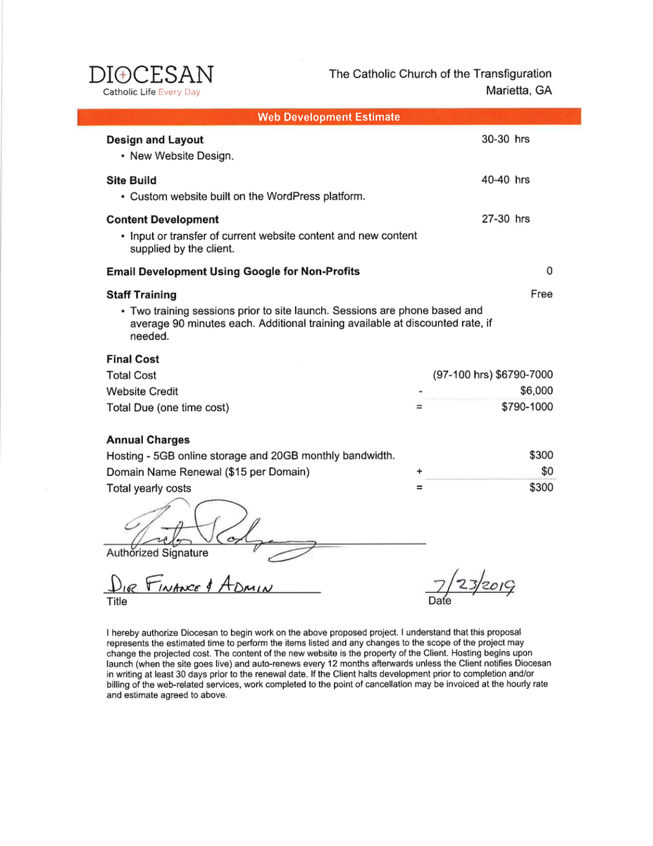 Very good. Attached is a new proposal showing the $6000 in web credit. If you (or the appropriate person at the parish) can sign it and send it back.