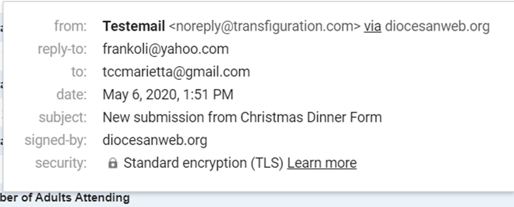 I got it to work. We have a anti spoofing rule on our exchange server. I turned it off for now. I think is rejecting the e-mail because the e-mail is being sent via diocesanweb.org. See below. Once we go live we need to figure out what to do if we continue to have the e-mails rejected.