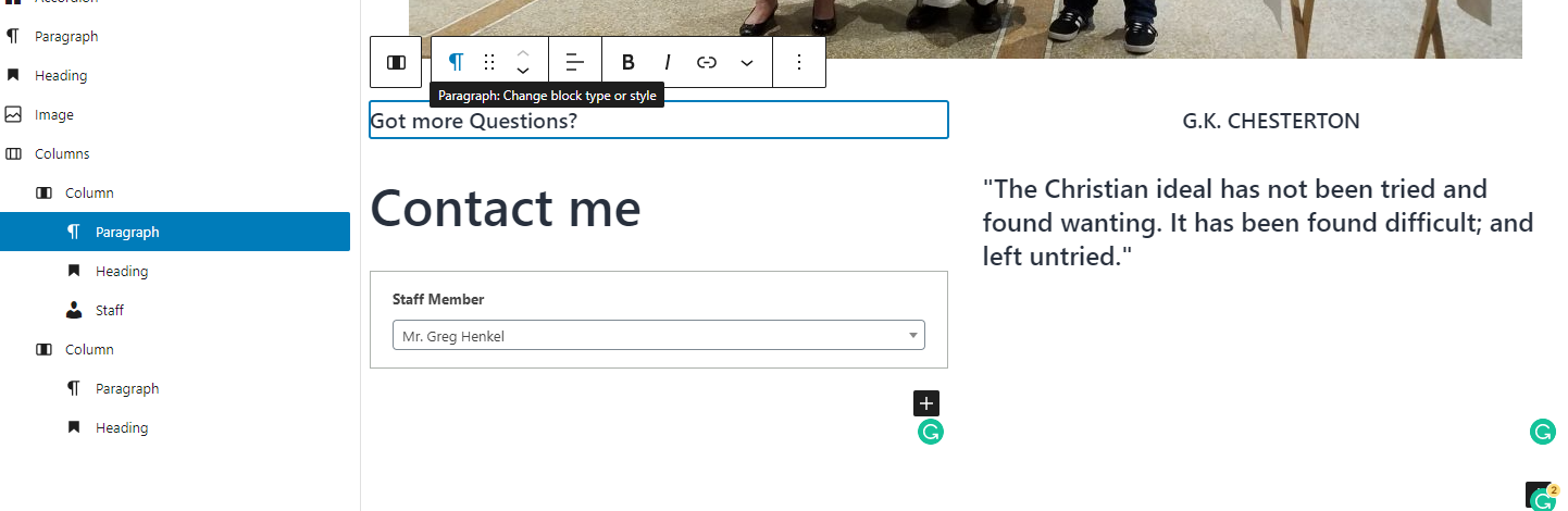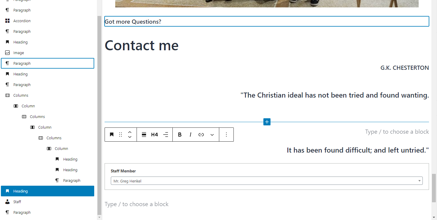 The reason that the quote is above the staff block is because that is the way it is laid out in the backend. The staff block is not part of the columns (although it might look that way on the front end). You also have a columns nested within a columns nested within another columns. This should never need to happen. You will only ever need one "Columns" (note the 's') block with multiple "Column" (no 's') blocks within it. You can then adjust these "Column" blocks to the desired width. This is what was happening with that Join the Parish page we went over last week Monday. It looks like he partially fixed it but GK.. is now next to X104 and the quote is jumbled next to "Email me." If he just drops everything down a few lines and it should solve the problem.