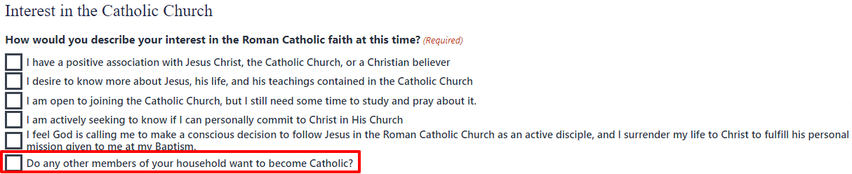 I already added that question to the checkbox field of "How would you describe your interest in the Roman Catholic faith at this time" under the "Interest in the Catholic Church" section title.